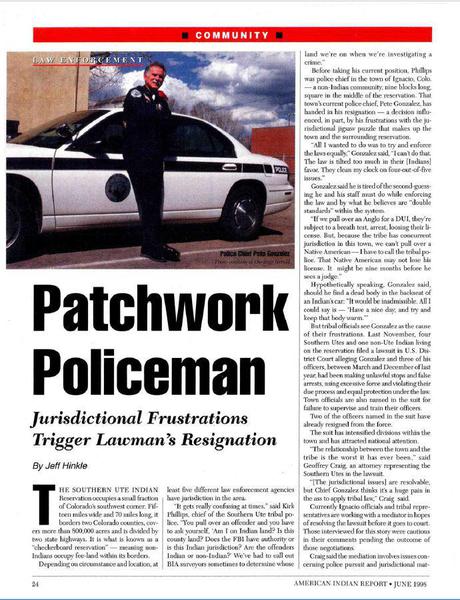 American Indian Report • 01/21/1998 Patchwork Policeman A portrait illustrating the complicated, overlapping legal headaches tribal police routinely negotiate.