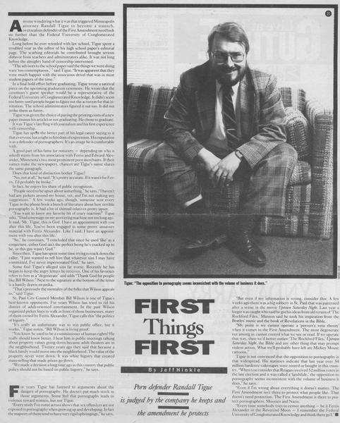 Minneapolis City Pages • 10/01/1988 First Things First Profile of renowned First Amendment zealot, Randall Tigue.