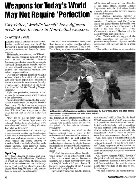 National Defense • 04/02/1998 Today's Weapons May Not Require 'Perfection' An overview of the Pentagon's investment in non-lethal weapons.
