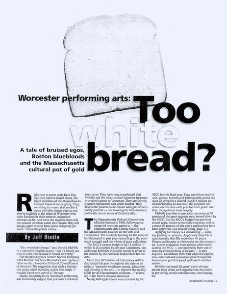 Worcester Magazine • 01/22/2000 Too White Bread? Are allegations that Worcester's cultural efforts are underfunded in favor of more prestigious projects true?