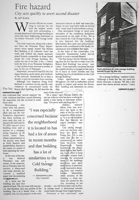 Worcester Magazine • 12/07/1999 Fire Hazard News piece I did on the heels of the tragic Worcester Cold Storage fire.