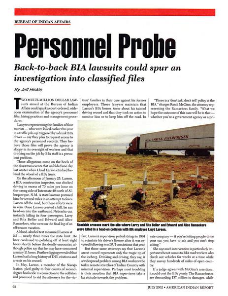 American Indian Report • 07/01/2002 Personnel Probe How one horrific automobile accident triggered two lawsuits aimed at the BIA.