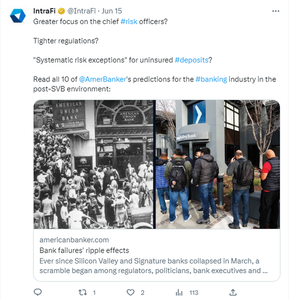 B2C Marketing • 03/01/2023 Social Media: IntraFi Social post identifying reactions to 2023 bank crisis.