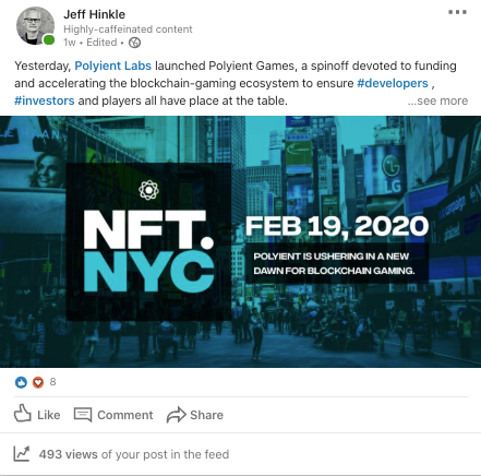 B2C Marketing • 02/19/2020 Social Media: Polyient Games Social post alerting followers to launch of Polyient Games incubator.